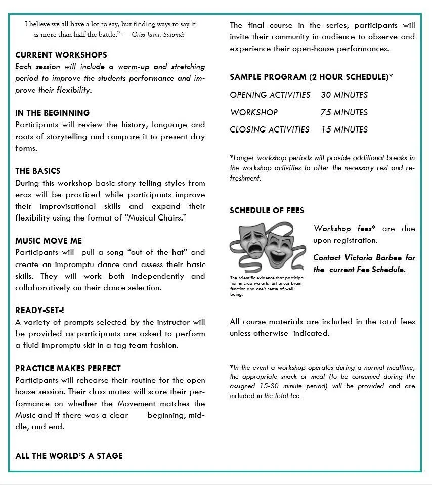 The mission of this play is to use the Healing Arts to promote empowerment for Women in recovery by using the Principles of Drama Therapy. Victoria's hope is to help to foster confidence, a new awareness, and to help individuals reclaim their lives, their power by establishing ownership of their narratives (stories).